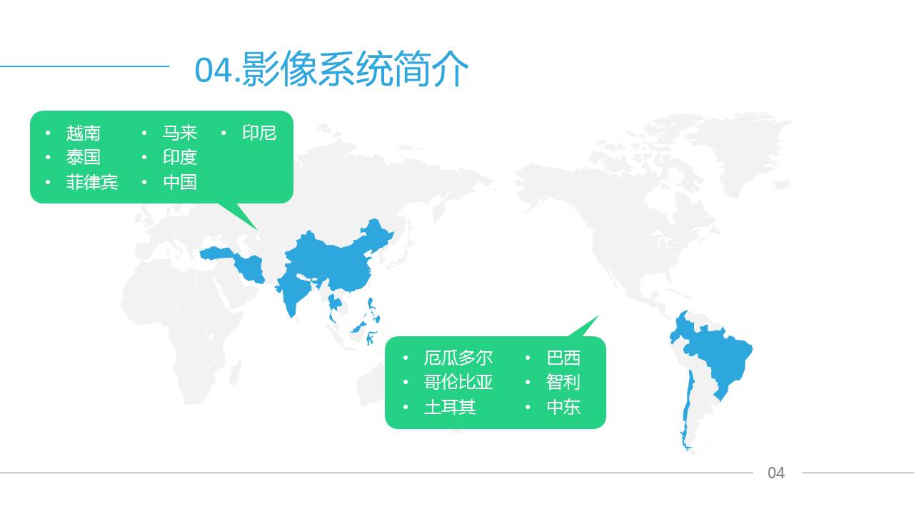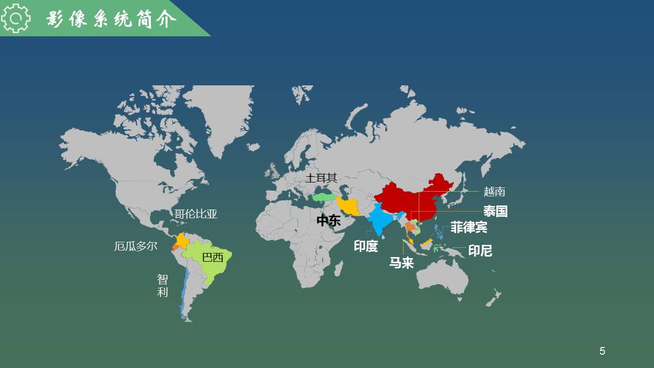 影像系统遍及全球,在涉及多国的幻灯片中,我们是一定要用到可编辑的世界地图的,然后用不同颜色标出影像系统所在区域范围即可。