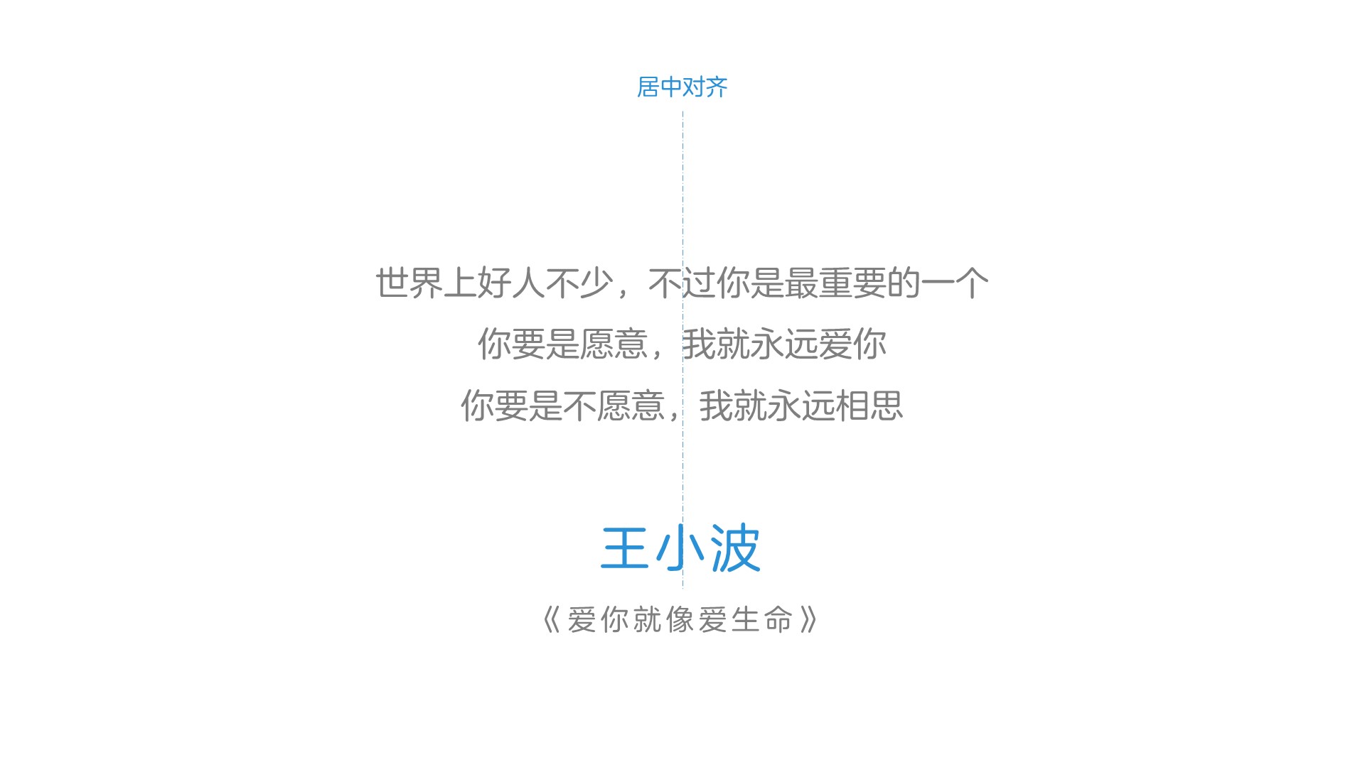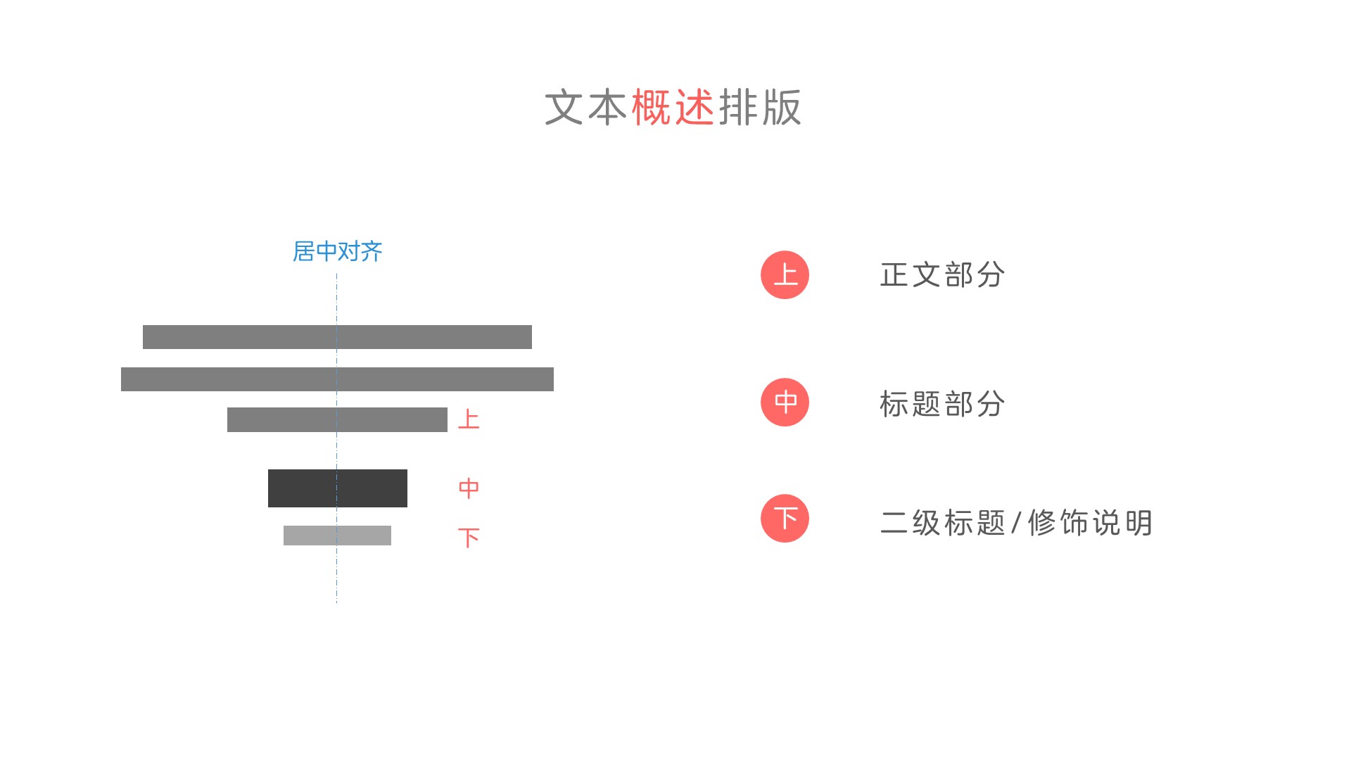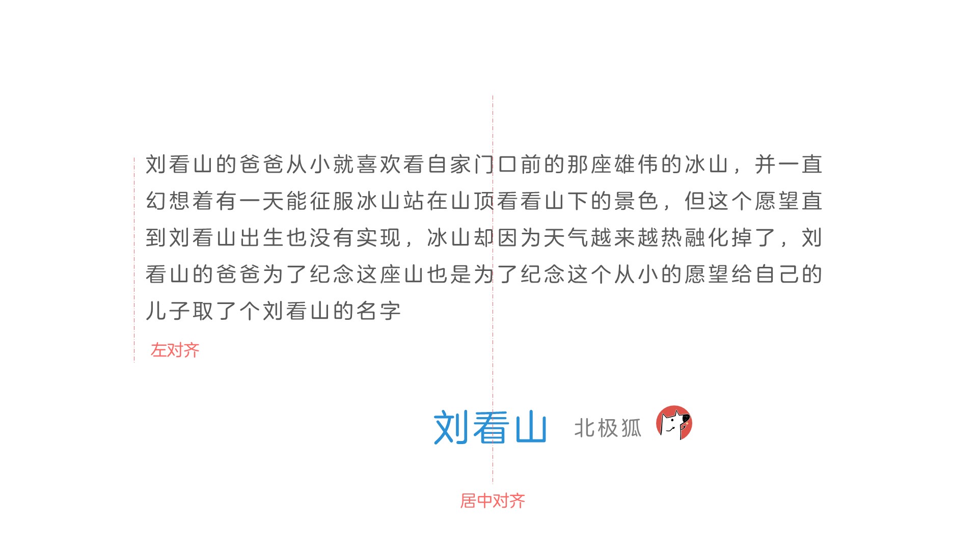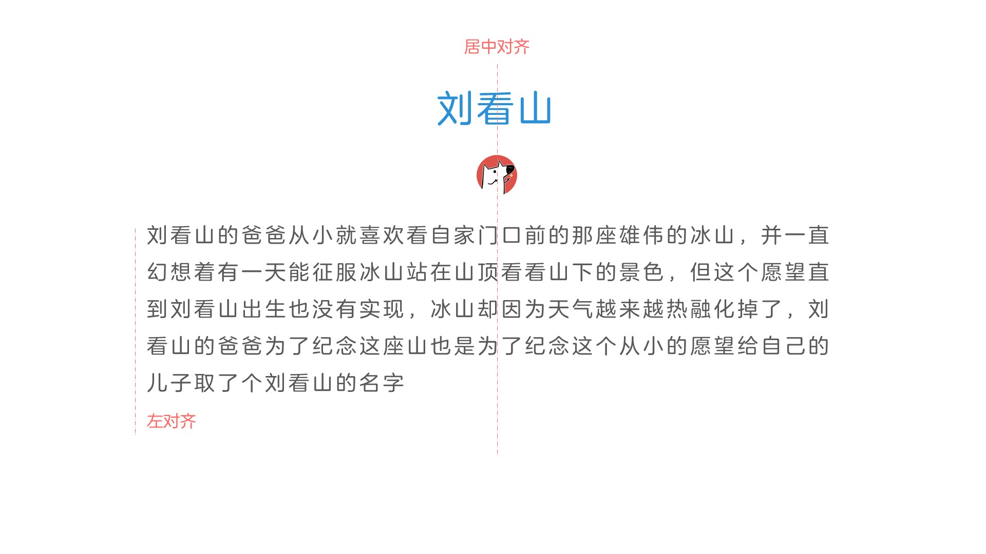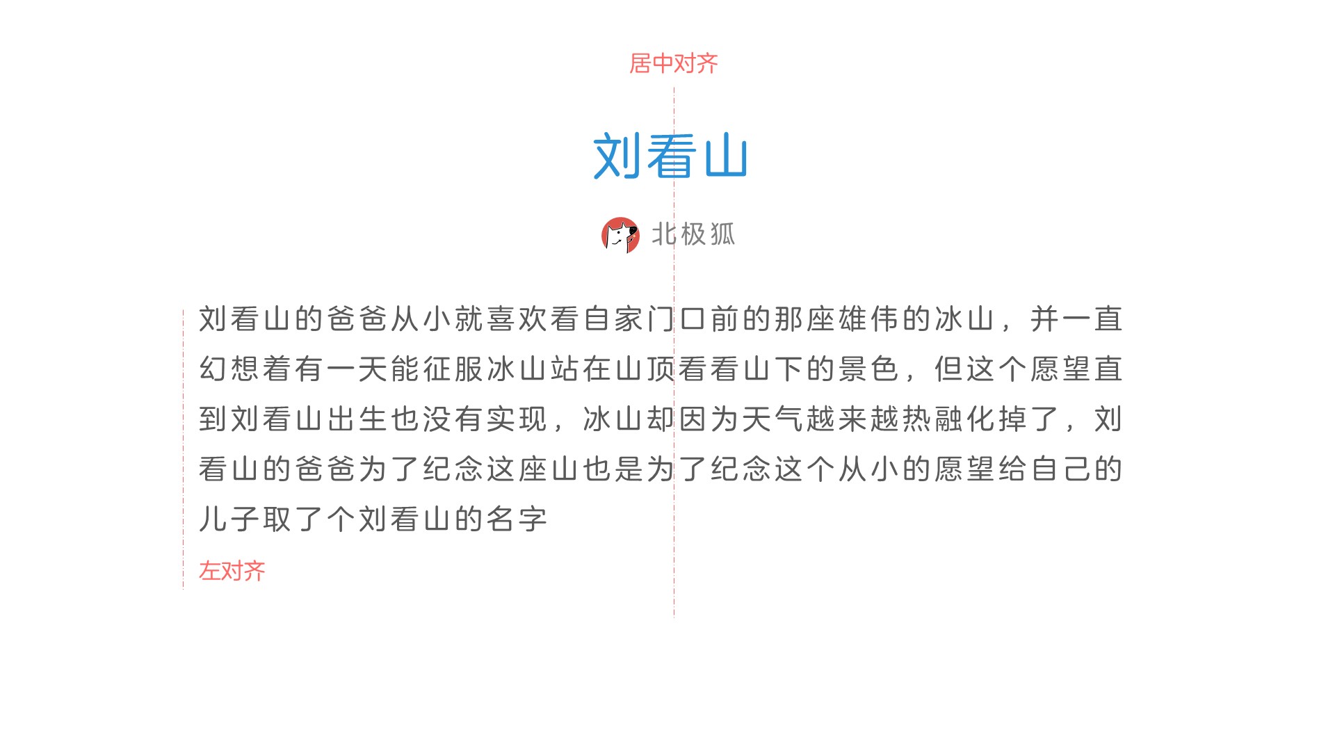 标题、二级标题/修饰说明呈居中对齐方式、正文部分左对齐方式。在这里解释一下什么叫二级标题/修饰说明:需要对标题进行细化说明或者完全独立于标题作为修饰性文字(图像),这时候可以添加这一个模块。
