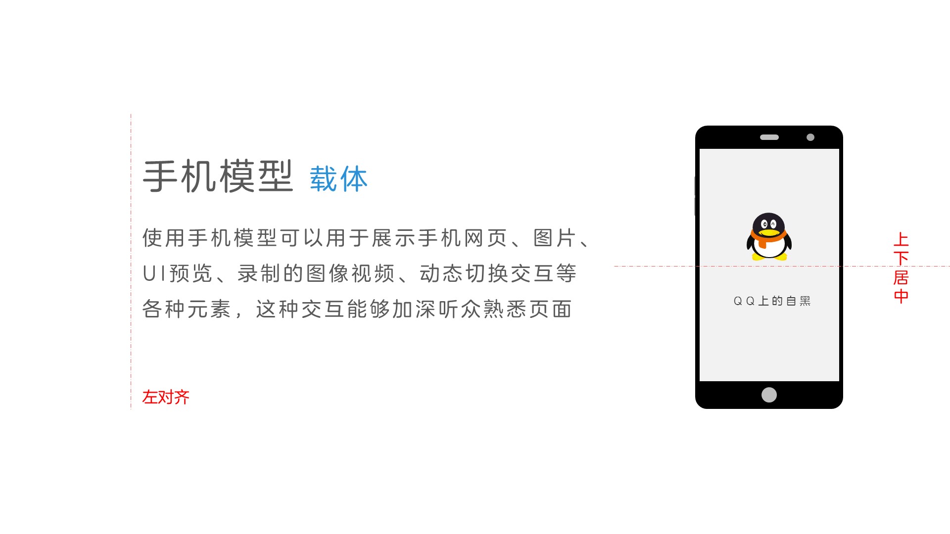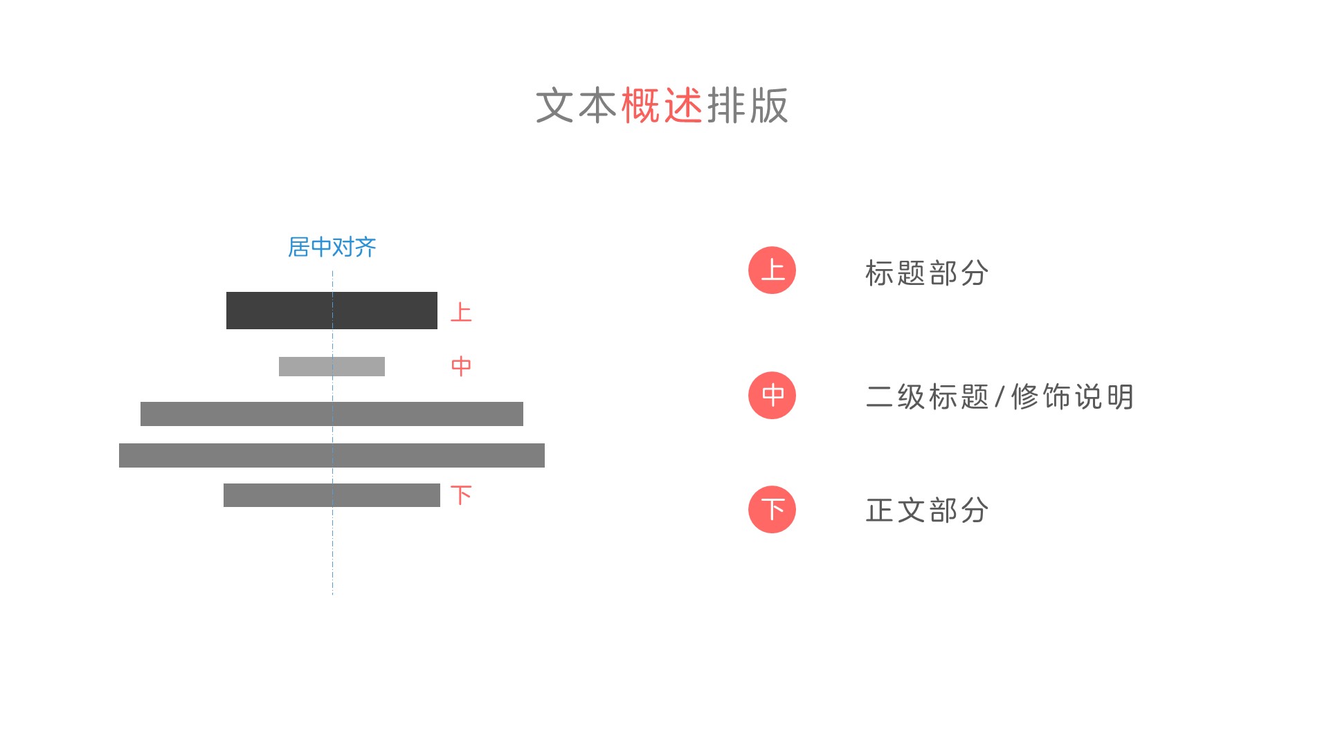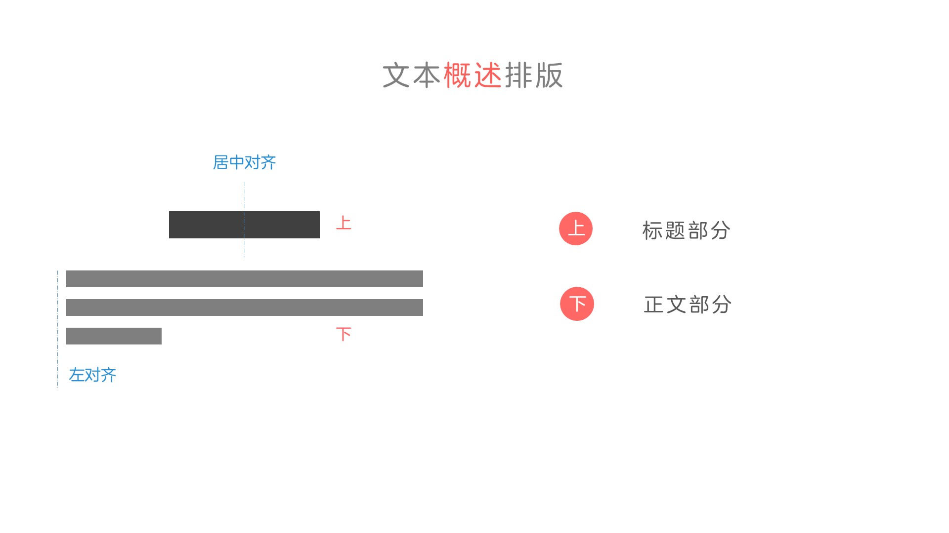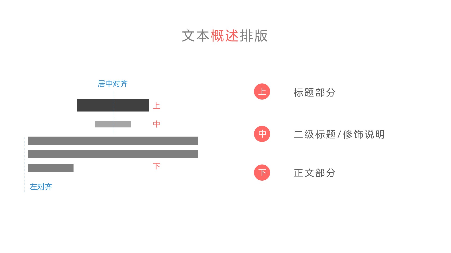 标题、二级标题/修饰说明呈居中对齐方式、正文部分左对齐方式。在这里解释一下什么叫二级标题/修饰说明:需要对标题进行细化说明或者完全独立于标题作为修饰性文字(图像),这时候可以添加这一个模块。
