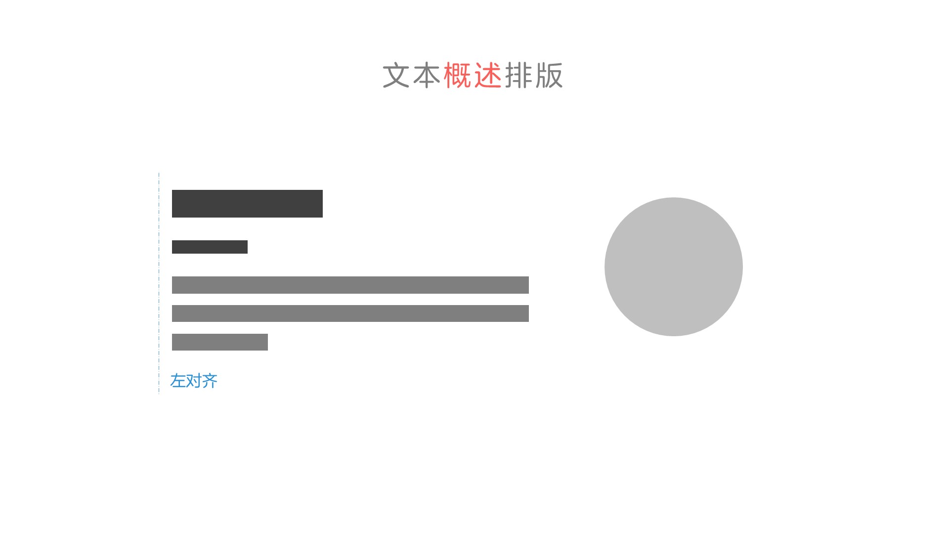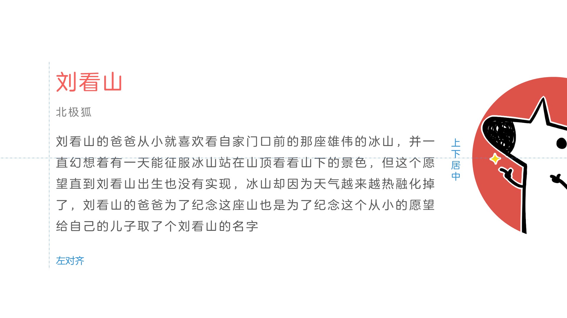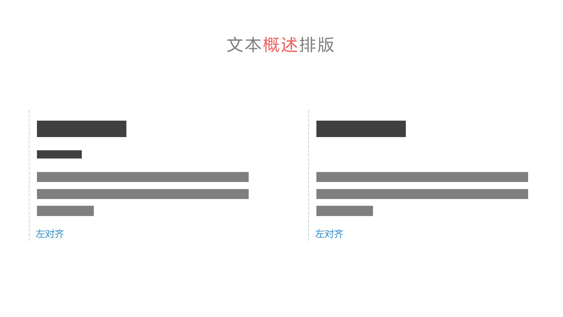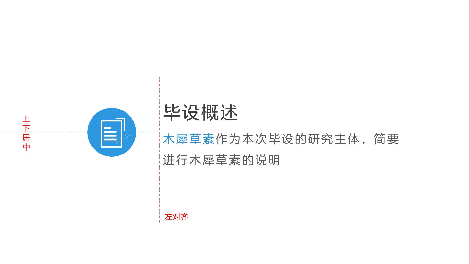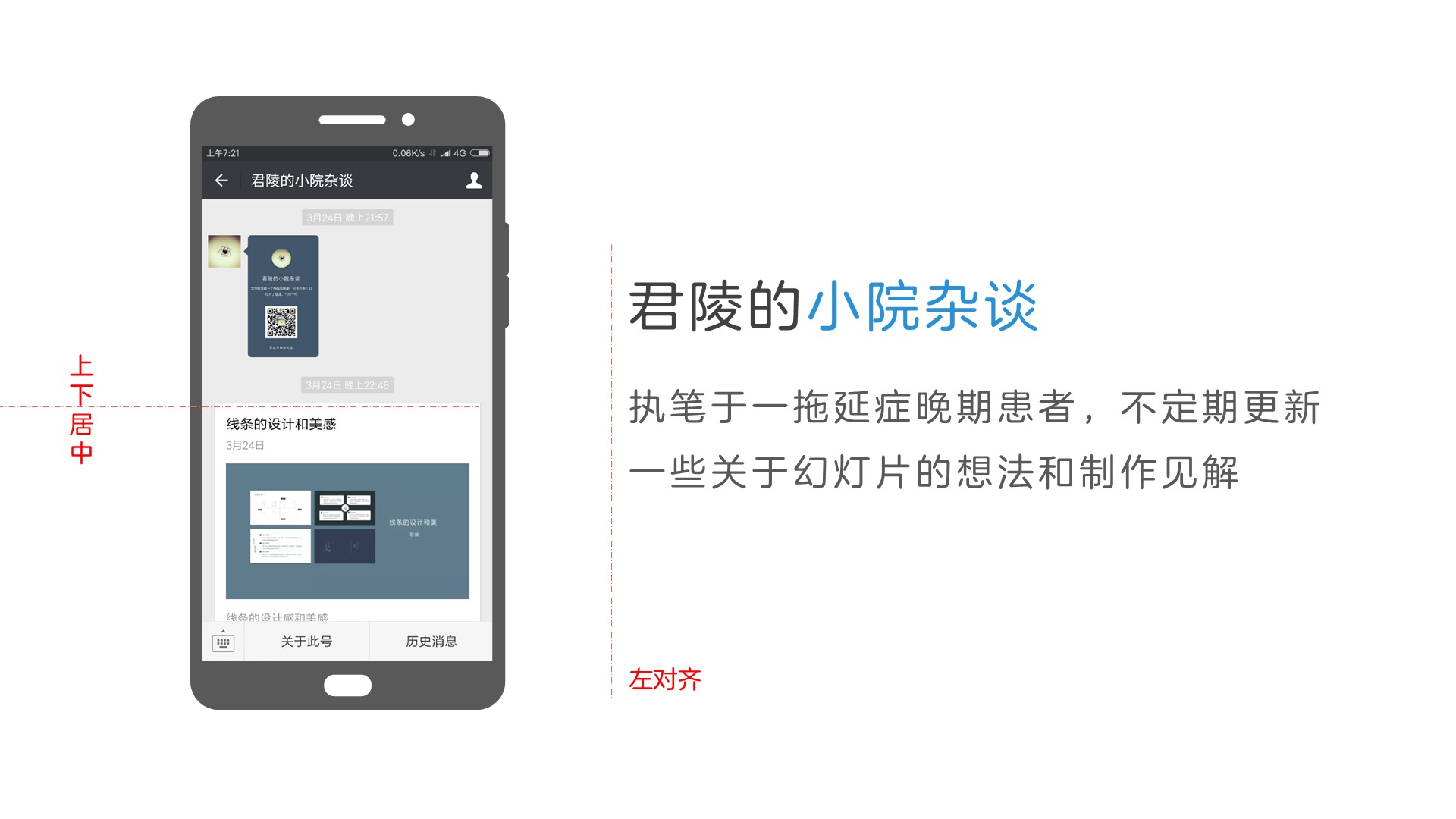 标题、二级标题/修饰说明呈居中对齐方式、正文部分左对齐方式。在这里解释一下什么叫二级标题/修饰说明:需要对标题进行细化说明或者完全独立于标题作为修饰性文字(图像),这时候可以添加这一个模块。