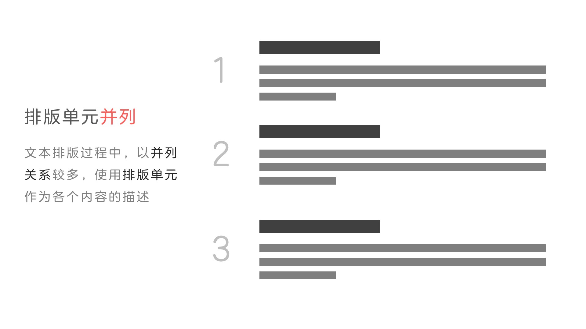 这里的并列项是基于排版单元,即独立的并列内容包括标题和正文概述。使用这种并列项的好处,通过精简的正文概述让人对于即将展开的内容有个初步的理解。
