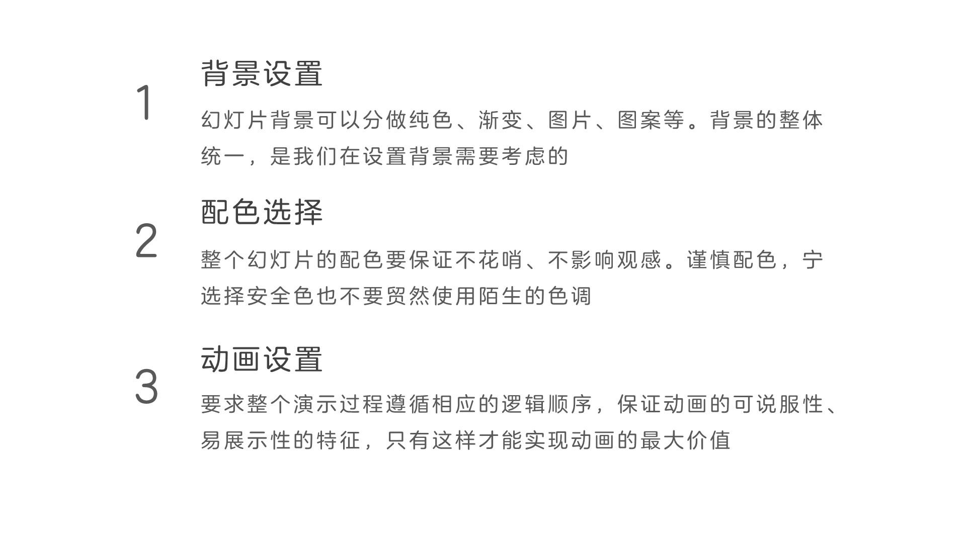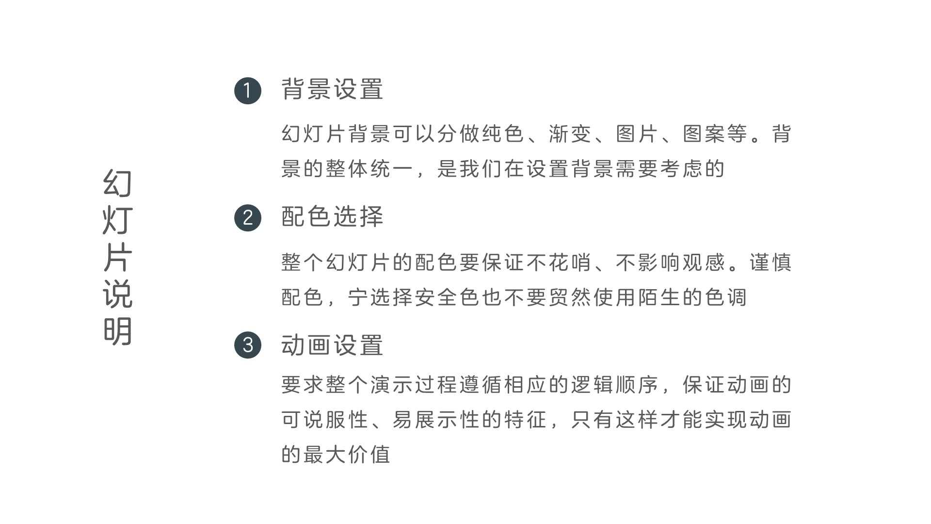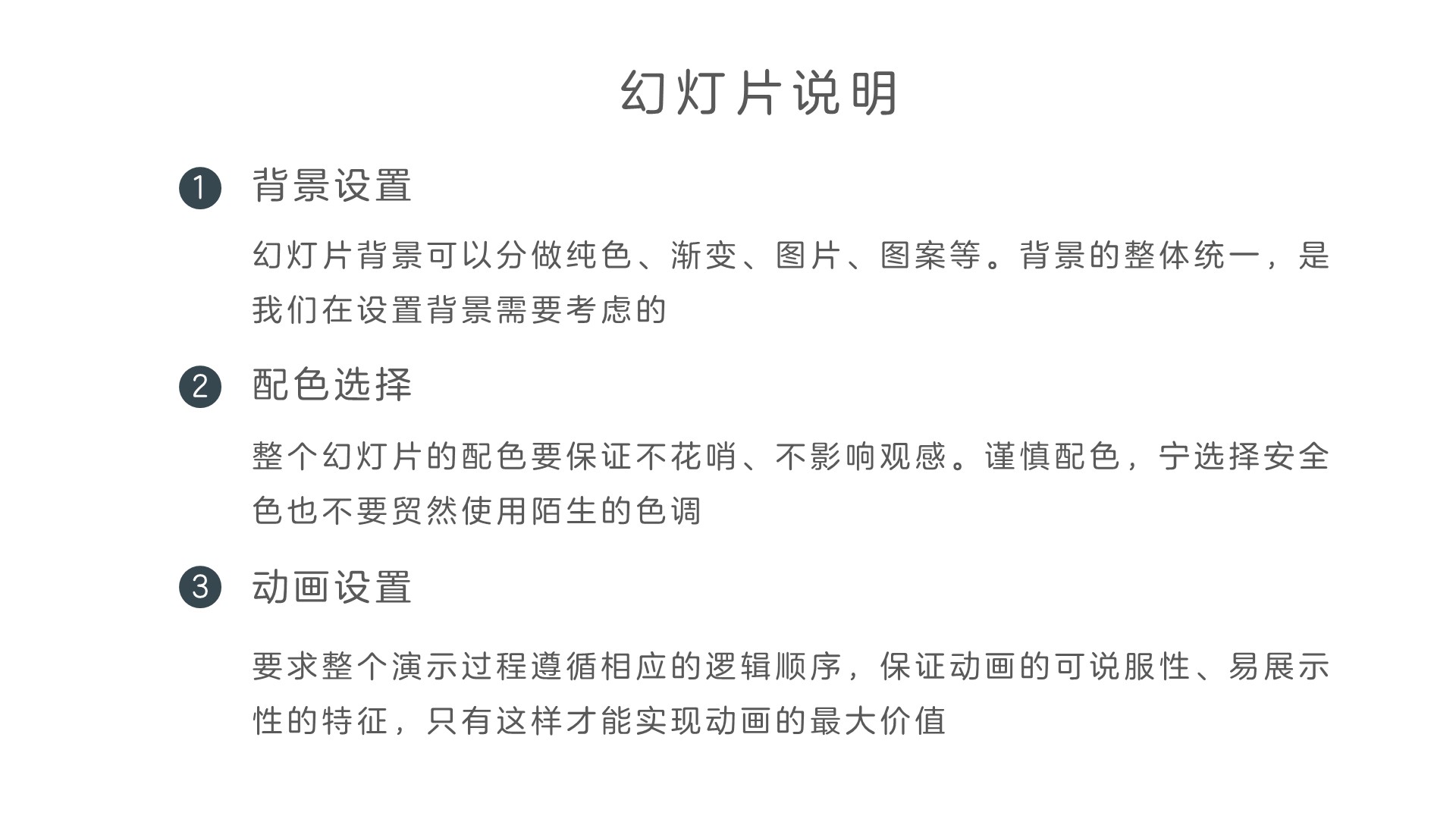 在处理这类大段叙述性文字怎么进行划分,这里参考上一篇文字幻灯片中文本排版之浅谈一,按照文字中提及到几个规则,让叙述性文本表达更加合理。下面是几种针对不同场景的排版说明: