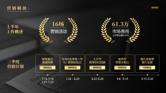 - 新稿配色采用企业LOGO色,与企业气质保持一致,同时加入与珠宝行业有关的背景图,增加封面的视觉表现力。
