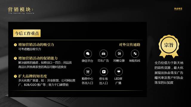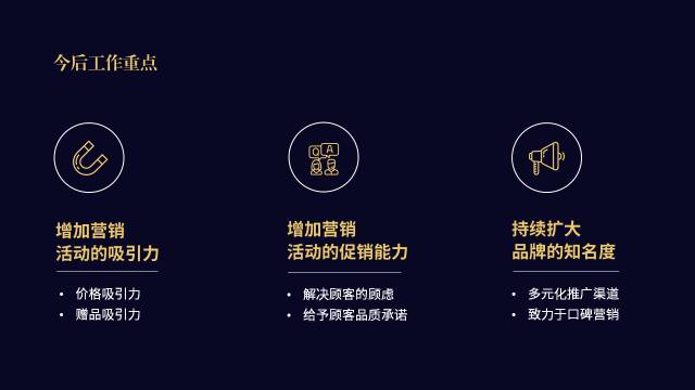 - 这一页讲述的是工作重点与宗旨,也就是方法-目的的关系,故将原稿的文字进行了相应的视觉调整,方法的放到一起,目的的放在一起,文案上也有所精简。