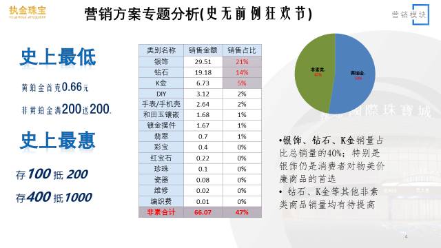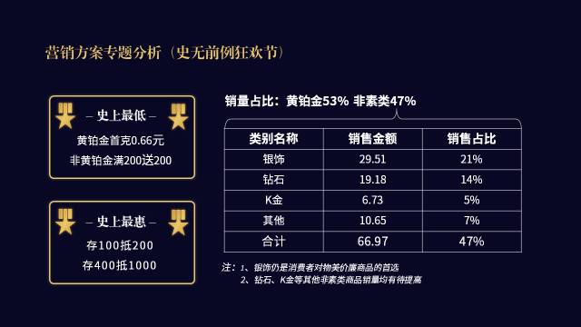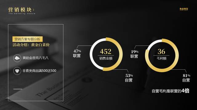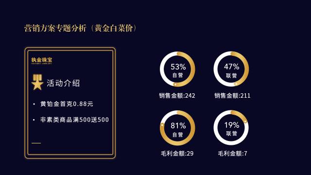 - 设计上采用圆环图设计,清晰表达黄铂金与非素类的销售占比情况,然后把非素类的各项类别单独拆分排版,从而在视觉上摆脱表格的呆板。