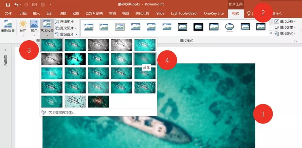 毛玻璃效果在PPT中的设置很简单,只需要选中图片,然后点击格式菜单下的艺术效果,里面就可以找到虚化了。