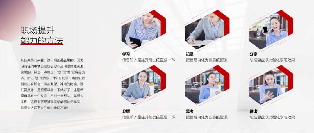 以上,就是6种在PPT设计中经常会用的,且区别于并列式排版的方法,不难吧!?